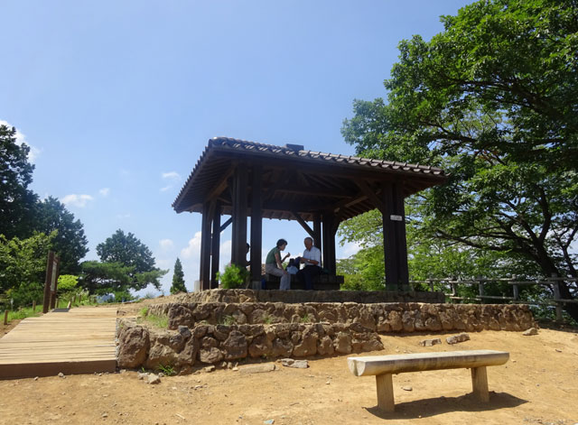 山頂からは大展望が広がる。真西に御岳山と奥の院。日の出山が御岳山から見て日の出の方向にある山だと納得。北には鷹ノ巣山、長沢背稜、本仁田山や川苔山の奥多摩の山々。あずまやからは筑波山、関東平野の中に西部ドームやスカイツリー。東京湾の手前には横浜ランドマークタワー、江ノ島。そして大山から大室山、加入道山までの丹沢の山並み。その手前に馬頭刈尾根。そして剣ヶ峯だけだが富士山が望める。大岳山も大きい。早めの昼食をとりながらゆっくりと展望を楽しもう。なお、山頂から御岳山方向に階段を下りたところに立派なトイレがある。
