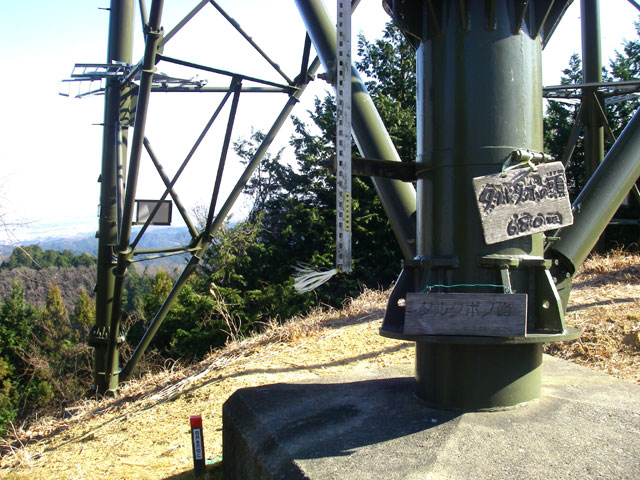尾根道に戻ってしばらく行くと「日本山岳耐久レース65km地点」と書かれた道標がある。金比羅尾根は有名なトレランの大会、ハセツネコースの一部でもある。その先の右手に「タルクボノ峰登り口」の札が下がっている。数分も登れば高圧線鉄塔が立つ山頂に出る。鉄塔の脚に山名と680mと書かれた板が付いている。明るく日当たりのよい場所で、鉄塔の脚の間から白岩山方面がよく見える。