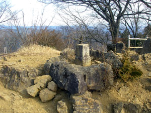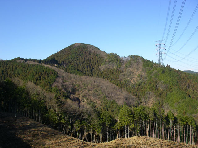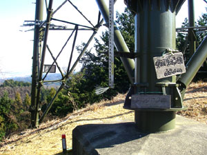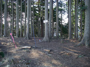 左手にきれいな三角形の麻生山が見える。クロモ岩見晴台を過ぎたところに分岐があり、「御岳山」という表記の上にマジックで「金比羅尾根」と手書きされた道標がある。ここは、今は直進するのだが、後で日の出山から下りてきた時に金比羅尾根に入るところなので、よく覚えておこう。階段状に丸太が置かれたところを登っていくと「三室山・二俣尾駅」への道を右に分け、もうひと頑張りすれば日の出山山頂だ。