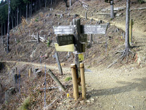 山頂をあとに、来た道を戻り、先ほどの手書きの「金比羅尾根」の道標のところで右に入る。少し下ると日の出山を巻いて御岳山へ至る道に出る。ここは道標に従って左折。すぐに「上養沢バス停 金比羅尾根」の道標があるのでここを右に入って下りきり、登山道と合流すると上養沢バス停への分岐だ。ここからが金比羅尾根の尾根歩きとなる。道標の「麻生山、金毘羅山、武蔵五日市」方向へ進む。左側の植林が伐採されたところをしばらく行くと、東京都環境局の「多摩の森林再生事業」の看板があり、伐採の理由がわかる。伐採された木が横に積み上げられているのは土壌流出を防ぐためだそうだ。伐採跡に広葉樹が植えられている。豊かな森林が再生することを願いたい。