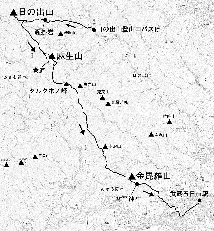 JR武蔵五日市駅前からつるつる温泉行きのバスに乗る。午後になると温泉を楽しむ人でいっぱいのこのバスも、早朝の便はほとんど貸し切り状態だ。20分ほどで日の出山登山口バス停に着く。沢を左に見てバスの進行方向に少し進むと、道が二俣(三ツ沢分岐)になっており、日の出山方面を指す道標が立っている。右へ向かえばつるつる温泉だ。左に入り15分程舗装道路を歩くと「日の出山ハイキングコース入り口」がある。