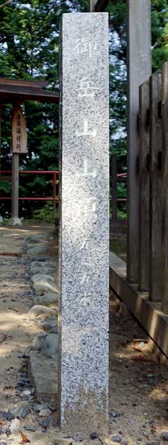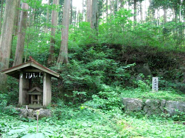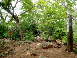 山頂でひと息入れたあとは、高明山(光明山)に向けて急で細い道を下って登り返すと高明神社跡に着く。そばに小さな祠がある。遷座された高明神社は下の軍道にある。上の高台に「高明山798m」の標識が木に括り付けてあるところが山頂だと分かる。かつてこの高明神社の参道だったと分かるスギの木が続く道を下り、ふたつの鳥居をくぐると、右に瀬音の湯に下りる道を分けて、軍道集落の上に出る。集落の間を通り、遷座された高明神社の前を過ぎて小学校横から養沢川のそばの軍道バス停に出る。