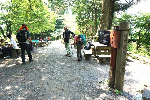 芥場峠の標識の立つところで左に高岩山への道を分けて少し上れば鍋割山分岐に出る。さらに30分ほどで大岳山荘(廃屋)に着く。大岳山を往復したら、馬頭刈尾根への標識を確認して大岳山を巻くように緩やかな尾根道を下る。鋸尾根からの道を合わせて、雑木林の中を、春ならツツジの花などを見ながらさらに下ると、右に白倉への分岐に出る。かつては大嶽神社への表参道であった檜原村白倉の里宮に下る道だ。白倉にある里宮は本社より立派なぐらいだ。往時はさぞやと思わせる、よく踏まれた急な道に丁目石(ちょうめいし)が一丁ごとに続いている。