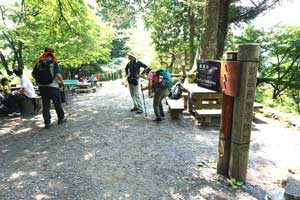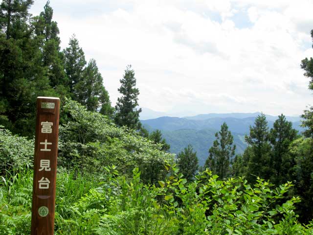 白倉の分岐からすぐに、今度は左に大岳鍾乳洞・上養沢への道を分けて、階段状の道を登り返せば東屋の立つ富士見台(1,054m)に着く。1/25000地形図には大怒田山が並んで記されているが、富士見台の説明板しかない。かつて西側が大きく開けて富士山がよく見えたのが、周囲の広葉樹林が広がって、お目当ての富士山が見えにくくなった。反対側の樹間からはいま下ってきた大岳山が独特の形を見せている。その右先には御岳山も見える。