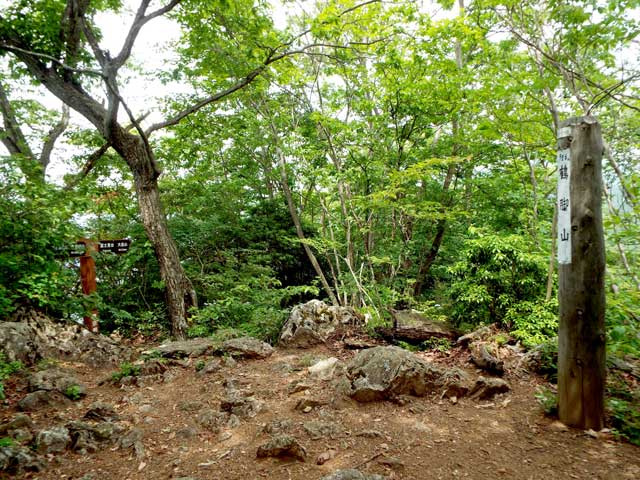 つづら岩からは緩やかなアップダウンをいくつか繰り返し、茅倉・千足バス停への分岐を示す標識をすぎて、やがて痩せた尾根道に出て大きな岩を登れば鶴脚山(916m)の狭い山頂に出る。木々に囲まれて展望はあまり利かない。山頂に出る前の岩場の斜面には、4月末にはイワウチワがかなりまとまって咲いているのが見られるので注意して歩くとよい。