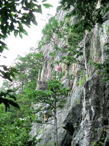 富士見台からわずかで小屋ノ沢山(1,010m)だが、気付かず通り過ぎるだろう。ヤセ尾根の下り、錆びた鉄梯子を下りると、古くからクライミングのゲレンデとして人気の巨大なつづら岩の基部に着く。週末にはいくつかのパーティが黙々とトレーニングしている。岩場に向かって右の高みはつづら岩山(969m)と呼ばれている。つづら岩の下を左に回り込むように登って鶴脚山に向かう。