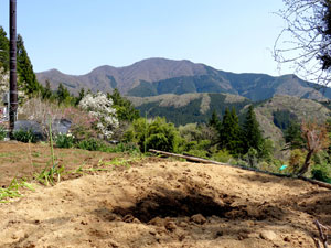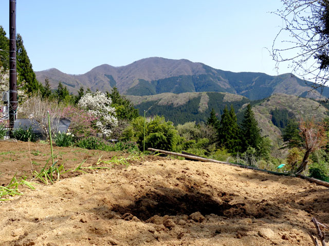 車道をヘリポート近くまで登り、北秋川の谷が見えると、浅間尾根の御林山あたりが近い。下の方に赤い屋根の民家が点在している。東安寺跡で左に曲がって登り出すと、白岩集落だ。標高が800mほどの高所に民家が10軒以上も点在している。マイタケ栽培の檜原きのこセンターやデマンドバスの白岩バス停がある。平坦な畑には色とりどりの草花が咲いて日当りもよく、気持ちよさそうな場所だ。住民の足となっているデマンドバスは平日のみ。上り6本、下り3本が運行される。右手には御前山が大きな山体を見せている。