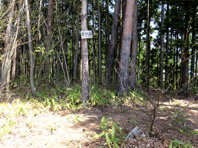 集落の最後の家から右の尾根上に山道が付いている。この道と並行するように林道が通じている。緩く単調な林道は歩きやすいが、脚は疲れる。左にマイクロアンテナを見て、カーブする林道を登ると、右手にこんもりした山が見えてくる。もう倉掛山でないかと思う頃、足元に手製の小さな標識を見つけた。標識に従って右上に少し戻るように山頂への急な山道が通じている。山頂は樹林の中で草木が生い茂る。頭上の木には小さな手彫りの山名プレートが取り付けられている。周囲に高い山もなく、樹間から南に浅間尾根や笹尾根あたりが見え隠れする。取り立てていうこともない山頂だが、静かで落ち着いた雰囲気が好ましい。
