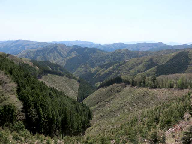 林道に戻って歩き出すと、南東方向の視界が急に開け北秋川のパノラマが広がる。手前の浅間尾根と背後の笹尾根が左右に長く重なって連なり、その奥には丹沢の山並が霞んで望め、振り返ると大岳山が特徴のある姿を見せている。旧道の山道もあるが、道が荒廃しているので歩きにくい。