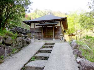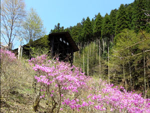 急坂をジグザグに登り出すと右に古い民家がある。道祖神横の細い道を、小さな赤テープを頼りに直進する。少し暗いスギの植林帯を進む。山腹の道は細くて歩きづらい。滑らないように注意。下から登ってくる道がいくつか合流するが、小さな沢を渡ると山道はゆっくりと右に登っている。道は不明瞭で不安になるが、尾根の左斜面を進んで古い民家に出る。