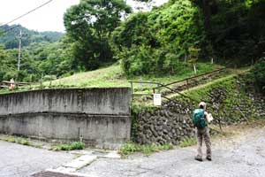 この先、幅1m余りのコンクリートで固めた山道になる。スギの枝や落石があり、歩かれている様子がない。この上に臨時ヘリポートと車道が尾根を横断している地点があるが、直進し、ガードレールの見える車道まで下って行く。臨時ヘリポートへの道はヤブになっている。登山口からここまでは車道を歩いてもよいが、時間がかかる。