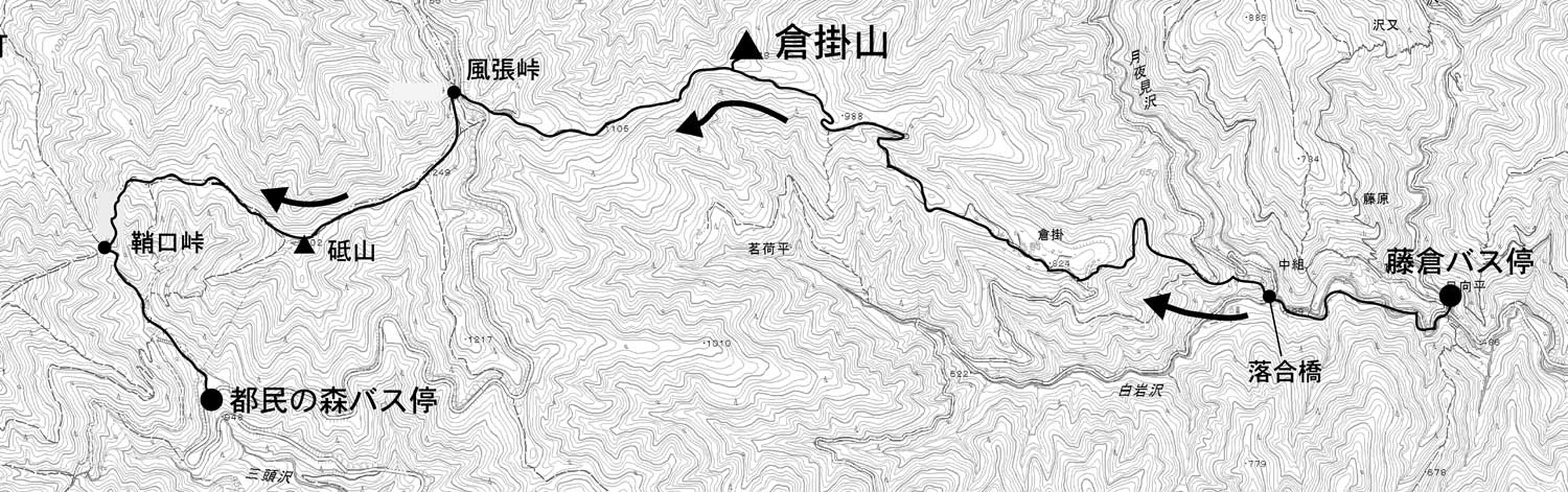 JR武蔵五日市駅から西東京バスに乗ると、約50分で藤倉バス停に着く。周囲が尾根に囲まれて、ここが東京かと思えるほどの山中にあるが、屋根のある立派なバス停であり、バス回転広場近くに綺麗なトイレもある。20mほど戻ると十字路に案内図がある。沢に沿って落合橋へ向う。民家や無住の寒澤寺を過ぎると10分ほどで落合橋に出る。右下の階段を下ると月夜見沢出合であるが、倉掛山へは消防団器具庫の向かい、デマンドバスのバス停がある地点から鉄柵に沿って、右上に畑の間の細い山道を登る。標識は倒木の下敷きになって折れている。