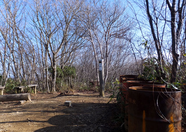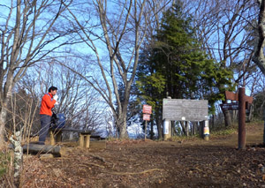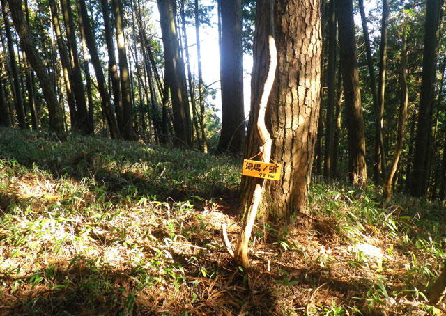 落ち葉や雪の季節は注意したい。しかし、そこはかつての往来道。ルートの大半は明瞭で、高低差の少ない尾根歩きが続く。背丈ほどの笹の中を進むと、やがてスギの植林帯が見えてくる。細い登山道をトラバースしながら徐々に高度を下げて行く。コルを越えて台地状になったところが湯場ノ頭(ゆばのあたま/ 927m)である。湯場ノ頭の先は尾根が分岐している。「作業道通行止」の標識がある北北東の尾根には入らず、北北西に延びる尾根を緩やかに下る。この先はしばらくなだらかな尾根道が続く