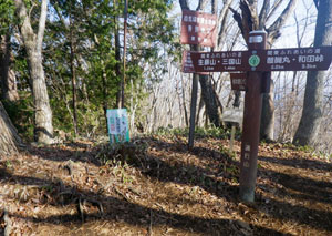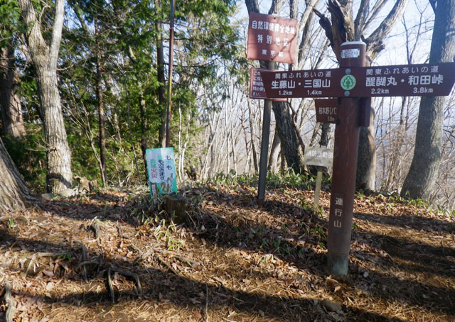甲斐・上野原から相模の最北端を通り、武蔵・檜原村へと抜ける道がある。『ふじ乃町の古道』によれば、この道はその昔、薪炭・木材・茅草などの山林生産物の生産・搬出のために使われた生活の道であり、また御嶽講が武蔵御嶽神社へ向かうために歩いた信仰の道でもあった。JR上野原駅からバスで20分ほどの井戸バス停から軍刀利(ぐんだり)神社を経て三国峠(960m)へ。三差路をサクラ並木で有名な尾根へと通じるルートを進む。400mほどで尾根の上でサクラが出迎えてくれる。分岐を左折し、スギとミズナラの中にサクラが点在する尾根をしばらく行くと、三国峠頂上と巻道の分岐に出る。ここからは10mほどで三国峠頂上だ。東に進路をとり、生藤山(990.3m)へ向かう。東斜面は、表土が削られ岩がむき出しになっているため少々注意が必要だ。このあたりが神奈川県の最北端。急坂を下り終えたところで北側を巻く道と合流する。
