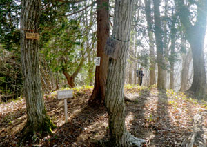 尾根の名ともなっている万六ノ頭は国土地理院の1/25000地形図では登山道が山頂を経由しているが、実際は大きく巻いており、道標の脇から薄い踏み跡をたどりピストンすることになる。迷いやすいわけではないが、ピークを目指す場合は、地図とコンパスをしっかり確認しながら進みたい。万六ノ頭は意外と大きな山だ。頂上付近はゆったりと平坦で、コナラやミズナラが多く新緑や紅葉の時期には尾根歩きの疲れを忘れさせてくれる。山慣れた人ならそのまま山頂を越え、踏み跡をたどって巻道に出てもいい。 登山道に戻り、万六ノ頭の中腹を巻き、よく手入れされた美しいスギ木立を進む。コナラ、ミズナラ林とスギ林のパッチワークが目に飛び込んでくると、これを合図に登山道は傾斜を増す。二度三度折り返すと、スギの大木が尾根の突端で出迎えてくれる。樹齢数百年はあろうかというその木の根元には小さな祠がある。手を合わせ山行のお礼を述べたら、尾根と分かれ柏木野を目指す。斜面に幾重にも折り重なる登山道を伝い、谷に下りて行く。途中、アジサイが広がる台地があるが、バスは1時間に1本程度しかないため、道草を食って時間調整を間違えないようにしたい。台地の先の急坂を下り、南秋川に掛かる小さな橋を渡れば、もう目の前が柏木野バス停だ。