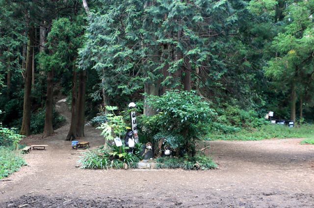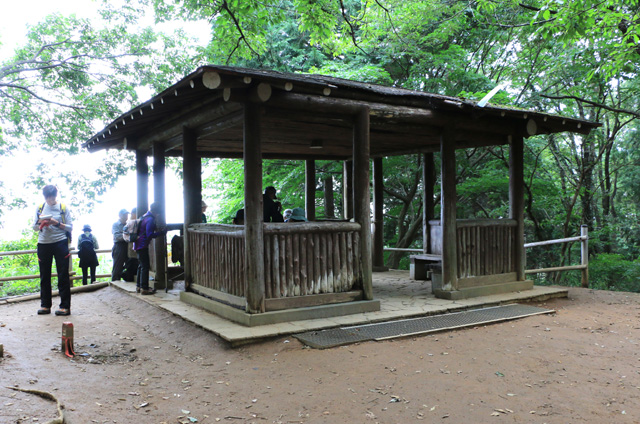 急坂を上りながら、ところどころ木漏れ日の入る道の左側には雑木林の間から草戸山など南高尾の山々が見えるのが嬉しい。稲荷山コースのおよそ中間地点である稲荷山(400m)までは40分ほど。ときどきなだらかなところもあって気持ちがいい。東屋の中で休憩する人、展望台から八王子市街や都心を眺める人とさまざま。