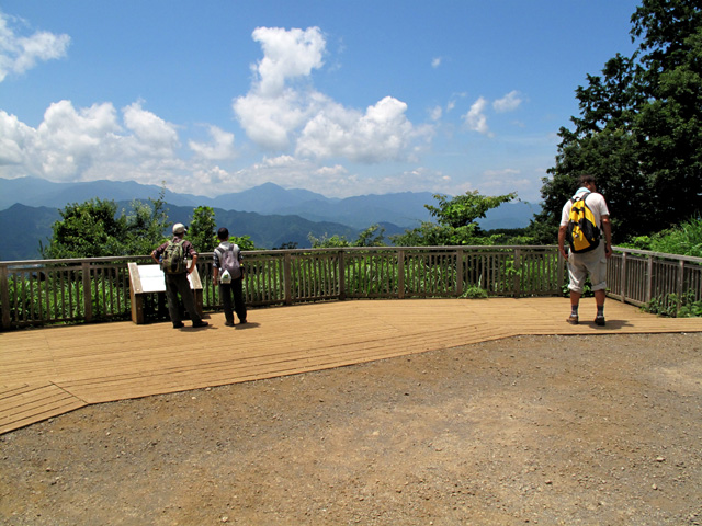 デッキ状の階段が植林の中に続いている。右側のスギの植林が伐採されて、以前は鬱蒼としていた山道が明るくなり、日影沢の林道まで見通せるようになると10分ほどで小仏城山に着く。高尾山の山頂から1時間10分ほどだ。広々とした山頂には茶店が2軒、神奈川県と東京都に分かれている。神奈川県側にあるのが城山茶屋、東京都側が春美茶屋。下に相模湖、目の前の丹沢や道志の山々の向こうには富士山が大きく望める。南西へ下る道をたどると相模湖に出られる。