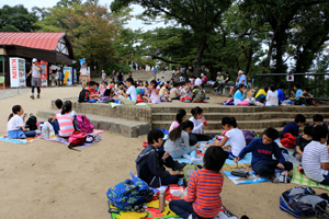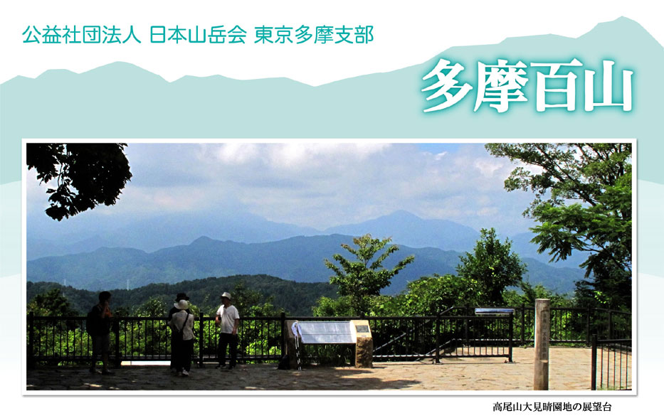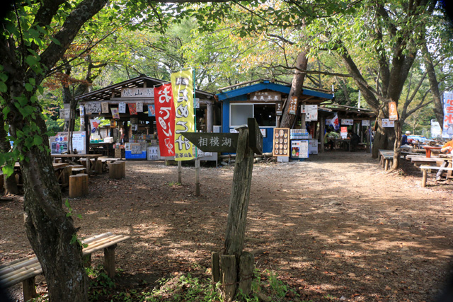 山頂から石段を下りて、下の広場からもみじ台に上り返すと、大きな看板に「ここより奥高尾」とある。左右に巻道があり、上がったところには茶店がある。茶店の横のベンチや後ろの草の上にシートを広げて弁当を食べる人がぎっしり。目前に石老山や道志の山々、遠くに丹沢の山々が広がっている。