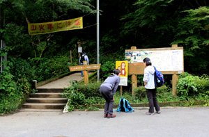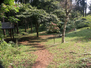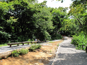 もみじ台から長い木の階段を下りたところで、下を通っていた巻道と再び出合う。長い階段の右側斜面には、夏になると大きなヤマユリの花がいつも無数に咲いていてほっとする。階段を下りた鞍部から左に大垂水峠への標識を見て真っすぐ一丁平への緩い上り道を行く。土が流れて階段の道が深く掘れて歩きにくい。大垂水峠への分岐から30分足らずで一丁平の開けた広場に出る。ベンチやテーブルがいくつも置かれている。ここからヤマザクラの木が小仏城山まで、2kmほど続いていて素晴らしいお花見ができる。高尾山頂、もみじ台に続く3つ目のトイレがある。長めの階段を上ると、眺めのよい一丁平の展望台に着く。