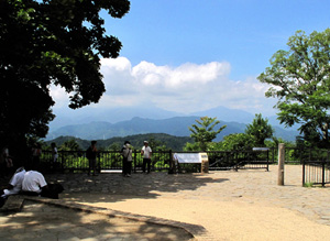 この分岐からは道幅が半分ぐらいに狭くなって、深く掘れた山道を0.5kmほど上ると、再びベンチのある広場に出る。頂上につながる丸太の階段が230段以上続く。息を切らしながら10分ほどで山頂の展望台に出る。
