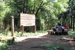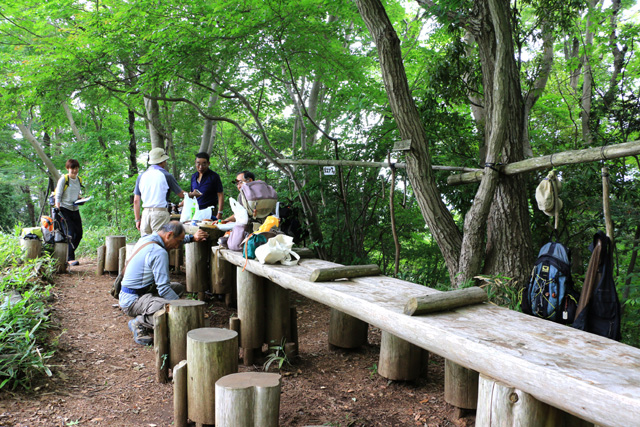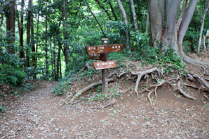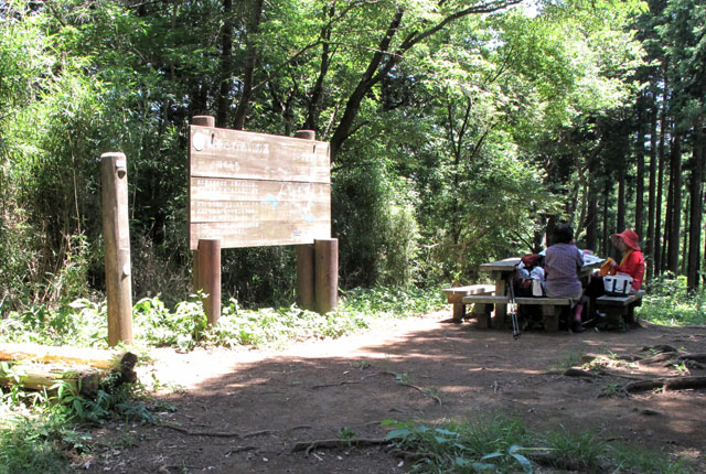 った林相となって、少し開けた大洞山に着く。南高尾山稜の最高点だ。初夏にはホトトギスやキビタキの鳴き声を聞くことができる。大きな案内板が立っていて登山コースや周辺の地形が分かりやすく描かれている。