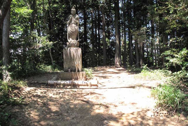 次はコンピラ山。登山道は下りとなって木製の階段が出てくる。周囲の樹林の中にはケヤキ、ヤマザクラの太い木が目立ち、足元にはさまざまな草花を楽しめるところだ。やがて「まきみち」と書かれた標識が出てくるが、そのまま縦走路を直進しよう。少し登り気味に尾根を進むと標石のある小さな突起に出る。標識はないがコンピラ山(514m)だ。木の間から正面に高尾山が見え、歩きづらい坂道を下ると、さっき分かれた巻道に合流する。ベンチのある広場から標識に従って登ると観音像が立つ中沢山(494m)のピークに着く。