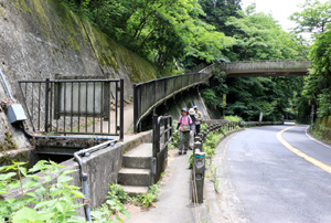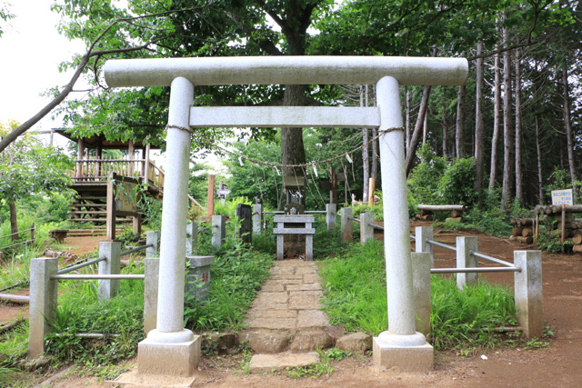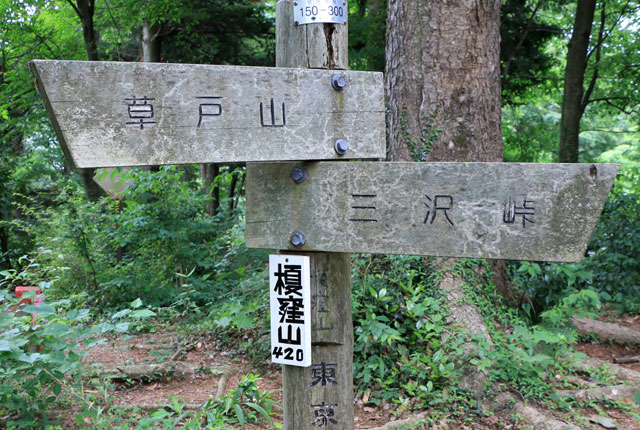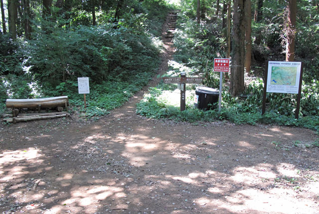 泰光寺山(475m)は、地形図には三角点のマークはないが、実際には三等三角点が山頂の真ん中に顔を出している。泰光寺山から急坂を下ると三沢峠だ。「関東ふれあいのみち」が梅の木平を東京都の起点とし、この峠に上がってくる。標識がなければそれとは分からない榎窪山(420m)を過ぎ、峰の薬師への分岐を大きく左に折れると草戸山へ続く広い尾根道に出る。すぐ先にある展望台に上がると視界が広がり、城山湖が足下に見下ろせる。やがて長い階段が現れる。反対から来ると段差が大きくて登りにくいところだ。最後に、また階段が出てきて、やっと目的地の草戸山に到着する。