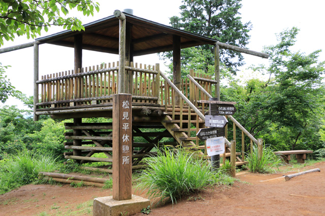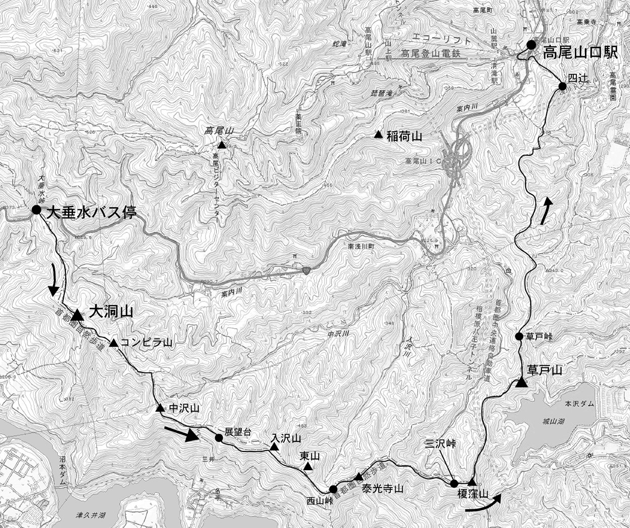 戸山は八王子市と町田市、相模原市の境界に位置する山だ。山頂は松見平休憩所となっており、立派な展望台があり山之神も祀られている。ここから高尾山口までの山道は意外にアップダウンがあるのでよく休んでおこう。山頂から下りとなった登山道をベンチのある草戸峠へ登り返すと、北に高尾山の上部が見える。JRの送電鉄塔下を過ぎると小ピークへの登りとなるが、疲れてきた頃なのできついところだ。高尾山口へ下る四辻のコルまでも小さなコブが多い。何度も上下を繰り返し、やっと四辻に着く。ここは京王線高尾山口駅への分岐で標識が立っている。余力があれば四辻から忠実に縦走路を北へたどり、1時間ほどでJR高尾駅へ向うルートもある。四辻から10分足らず下ると民家の横から道路に飛び出し、登山道は終了する。民家の角には登山口の標識もあり、逆コースでも間違うことはないだろう。国道を渡り、蕎麦屋や土産物屋の間を抜けると、京王線高尾山口駅も近い。