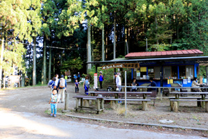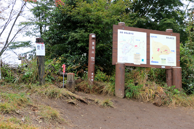 小仏峠からは40分ほどで景信山に着く。しばらくは滑りやすい道が続くが、そこを過ぎると緩やかで広い山道となる。山頂には茶店が2軒あり、週末や休日には多くの登山者で賑わう。早春からダンコウバイやアブラチャン、クロモジの木が黄色い花をつけ、4月にはヤマザクラが見ごろ、初夏にはヤマボウシの木が白い花でいっぱいになる。
