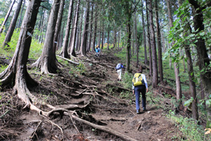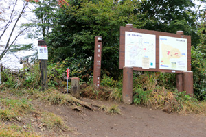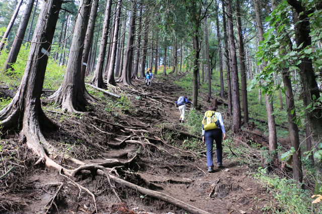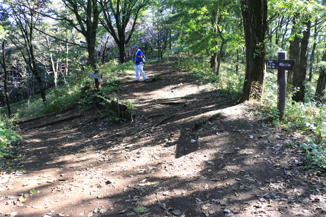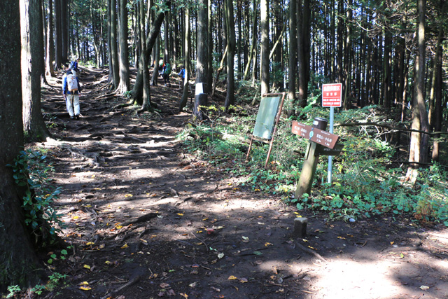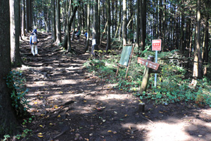 堂所山をあとにして、木の根がむき出しになって滑りやすい山道を明王峠に向かって下る。途中、右に下れば陣馬高原下、左に下れば美女谷温泉を経て相模原市の底沢に下りる底沢峠に出る。底沢峠は昔、明王峠と呼ばれ、小仏峠が開かれる前は武蔵から甲斐へ越える主要道だった。