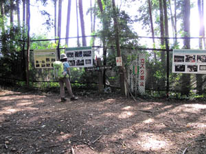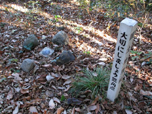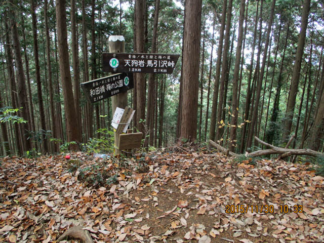 展望を堪能したら分岐点へ戻り、先へ進む。道が分かれるところには、たいてい道標があるので、確認してから進もう。日の出町分岐のところで広域廃棄物処分場のフェンスが現れる。直進すると日の出町への道であり、左に鋭角に折れてフェンスを右にするようになる。やがて左に小さな馬頭観音を目にしたら、そこから馬引沢峠(まひきざわとうげ)まではわずかである。峠には苔むした石垣の残る広場があって馬引沢林道が分かれ、フェンスには処理場の説明や写真が掲示されている。