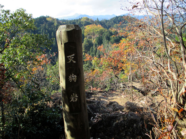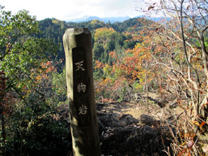 分岐に戻って天狗岩方面へ向かうと、途中わずかに露岩の急坂もあり、間もなく要害山(ようがいさん/414m)に着く。これといった特徴もなく、山名表示も読み取りにくいので、知らずに通り過ぎかねない。急な階段を下りきると、右側は伐採地が広がり、林道も見える。アップダウンを越えると天狗岩への分岐がある。天狗岩までは往復15分ほどで、階段を2カ所下り、急登すると露岩帯となり、その先に「天狗岩」と書かれた標柱が立っている。