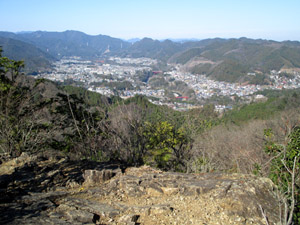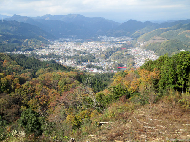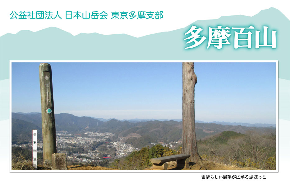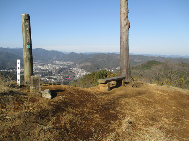 一段下がった岩のテラスが展望よく、西から北にかけて大岳山、日の出山、本仁田山、川苔山、高水三山、青梅丘陵などの山々、梅郷、和田など多摩川沿いの市街や橋が一望の下である。分岐に戻ってわずかに歩を進めれば、また分岐があって赤ぼっこが目と鼻の先である。解説板があり「関東大震災で表土が崩れ落ち、赤土がむき出しになったので土地の人たちが、そう言うようになった」という。1本のヒノキが立っており、三等三角点が置かれ、ベンチが2基ある。北から東にかけて奥多摩や武蔵野一帯の雄大な眺望が得られ、直下には晩秋は紅葉、初夏は新緑が彩を添えてくれるだろう。