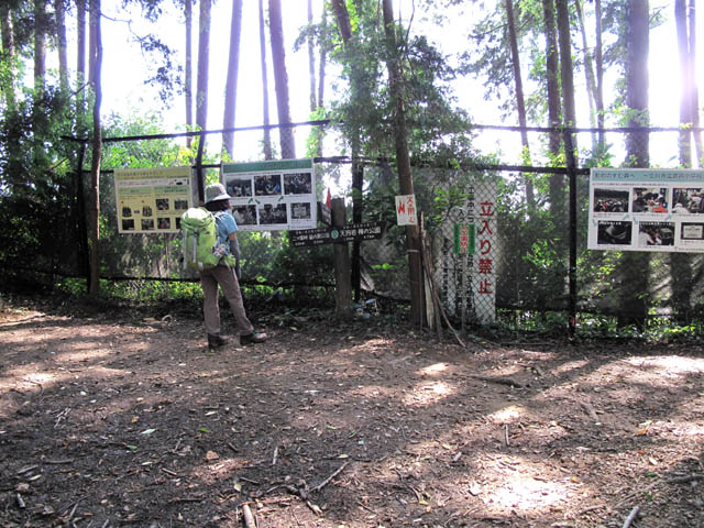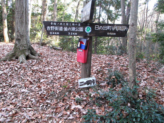 かつて、日の出町玉の内へ続く道は鎌倉街道だったが、今はフェンスに立ちふさがれて廃道化し、道標だけが空しくその方向を示している。峠から200mも行くと、畑中・駒木野への道が分かれるが、コースは右に鋭角に折れる。高度を徐々に下げて行くと道は二分し、右はフェンスに沿って小山を越えるもの、左はその左側を巻いていくものであり、その先で合流する。このあたりまで来ると樹木も多種見られるようになり、コナラ、ヤマザクラ、シラカシ、アカシデなどや、思わぬモミの大木に驚かされることもある。