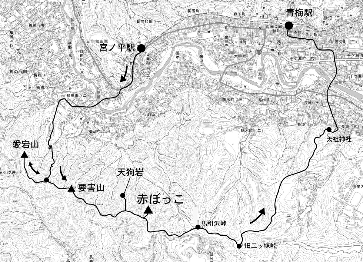 多摩川の流れが青梅市街に差し掛かる南側、青梅市と日の出町の境界に円弧状に連なる丘陵は、長淵丘陵ともいわれる。JR青梅線の青梅駅、その先の宮ノ平駅または日向和田駅からアプローチできるが、ここでは宮ノ平駅を起点とする。小さな駅舎の階段を降りるとすぐ前に青梅街道がある。右の線路沿いにある小さな公園から出発しよう。