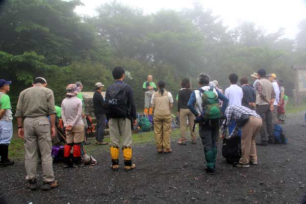 立川駅の北、多摩信用金庫前に07:00集合。みんな初対面だが、山行の装備をみれば登山教室のグループとすぐに分かった。なかには、早くも上下の雨具にスパッツをつけて「完全装備です」と張り切っている女性もいた。スタッフを含め43人が集まった。07:25、萩観光の50人乗り大型バスで登山口のある月夜野第二駐車場に向かった。車中で、酒井講師が「前回の講座の続きだ」といってマイクを握った。23日の座学で時間切れのため説明できなかった部分を追加で説明、ついでに「人里」、「笛吹」、「事貫」など街道沿いの難読地名を紹介した。