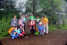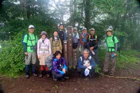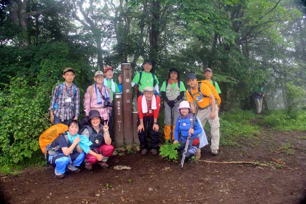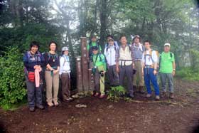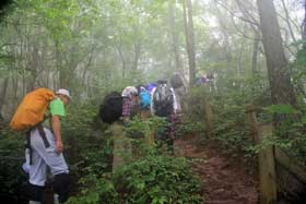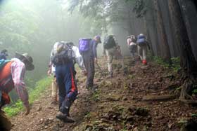 御前山に13:05到着。ガスがかかって幻想的だといえばそうだが、コースはぬかるんでいて足を取られる。下りが大変だった。脚に力がはいる。筋肉痛を起こしそうになる。ビスタリ、ビスタリだ。靴紐を締めなおす。それでも、いくつかの休憩をはさんで15:40、みんな元気で登山口に帰ってきた。バスに乗り込んだとたん大粒の雨が降り出した。下りは、休憩を含め2時間30分ほどの行程だった。(記録/橋重之)
