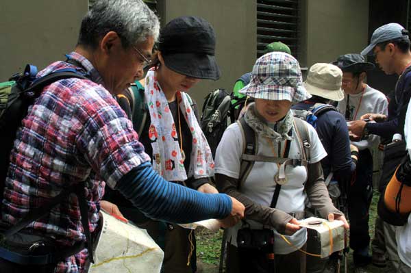 前回と同じように立川駅の北、多摩信用金庫前に07:00集合し07:25出発。08:55には都民の森駐車場に到着、準備体操などを経て登山開始した。バスのなかで、さきの講座で教わった「地図の読み方」と「山の天気」を宮崎紘一、城所邦夫両講師からおさらいしていただいた。