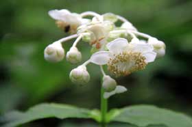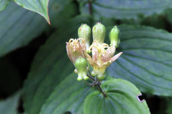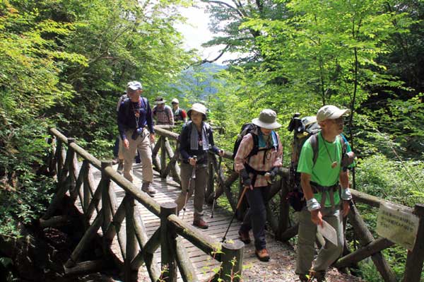 記念写真を撮り、再びムシカリ峠を経て来た道を引き返す。下りも大滝までほぼ1時間。ゆつくり下った。カメバヒキオコシがコースを覆うようにはびこっていた。葉っぱの先が3つに割れ、中央の裂片が亀のしっぽのように長く伸びている。シソ科の植物で学名はplectranthus kamebaという。空海大師が山地を歩いていると、修験者が倒れていた。それを見た空海は、そばに生えていた、ヒキオコシの葉のしぼり汁を修験者の口に含ませた。たちまち元気になり、また修行に向かったという。