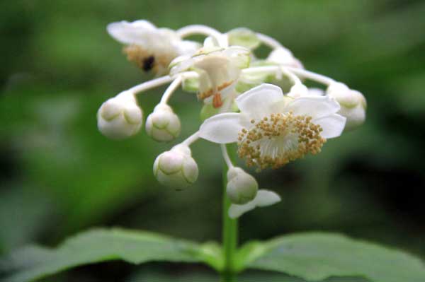 大滝は落差33m。夏の雨を集めて水量は豊富。風向きによって展望橋まで飛沫が飛んでくる。大滝からは、沢沿いの登りとなった。今度は等高線が気になる様子だった。曲線の向きで尾根と沢を区別する。地図読みが慣れてくると、それが山登りの楽しみとなる。途中、右手に三頭山の東の尾根から下りてくる登山道との分岐があり、テラスがあった。50分ほどで稜線に出た。標識にムシカリ峠とあった。避難小屋に移動し昼食を頂いた。周囲にムシカリの樹が多い。別名オオカメノキ。葉っぱが亀の甲羅に似ているとか、よく虫に食われるとか。