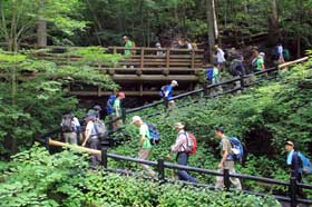 2回目の実習登山は8月4日、三頭山で行った。夏の真っ盛りだ。日本列島に最高気温が35℃を超えて猛暑日となる地点がぐんぐん広がっていた。しかし、標高1,000〜1,500mのコースは、山の冷気につつまれていた。みんな元気に歩いた。
