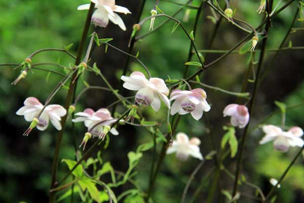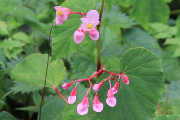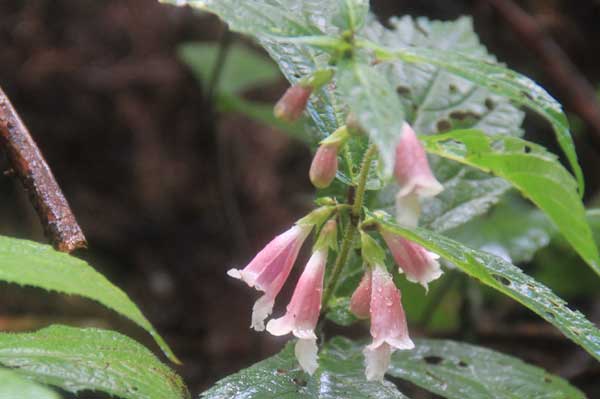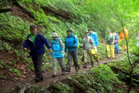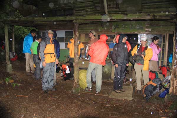 激しい雨が降り続いた。頂上までは30分足らずだが、直下に岩場がある。40人を超すメンバーで登頂は危険が伴うし、おそらく時間がかかり過ぎるだろう。しばらく待ったが、状況は変わらない。ついに登頂を断念し帰途についた。1時30分、山荘を出発し、同じルートを下り3時15分、ケーブル上の広場に着いた。晴れ間を縫ってレンゲショウマを観賞した。(文/橋重之)