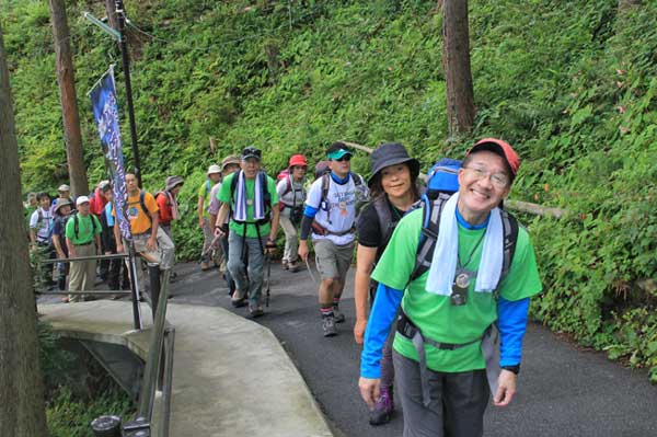 レンゲショウマが群生する富士峰は広場の右奥から登るのだが、左へ参道をとる。大岳山へは御嶽神社の境内を通過しなければならない。参詣者の案内・宿泊を業とする御師の集落、ビジターセンター、天然記念物「神代欅」、みやげ物店舗の並ぶ商店街などを通ると大きな鳥居に迎えられる。石段は工事中で脇の女坂を通って本殿へ。山行の無事を祈って長尾平(なごうだいら)に向かう。