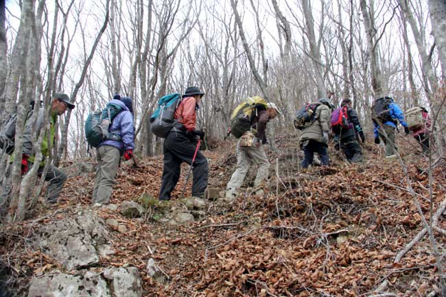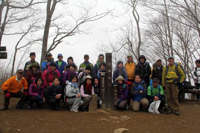 昼食後、いよいよ山頂へ向かう。下ってくる登山者が、しきりに寒い寒いと言っている。ガスは濃くなって、ブナの木々が寒々と立っている。それにしても、こんな天気なのに、なんとたくさんの人がいるのだろう。三頭山は人気者なのだ。12時過ぎに到着した目的地の西峰(1524.5m)では2班が待っていた。しばらく山頂を占拠して30名ほどで記念撮影。失礼しました。