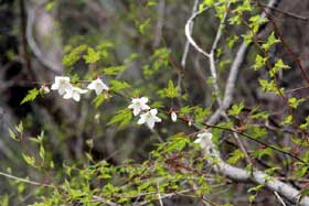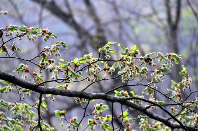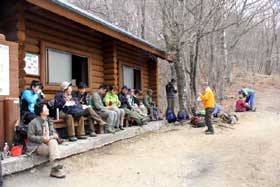 三頭大橋で大休止。見えていた青空も「やっぱり」という感じで曇ってしまっていた。各班で自己紹介を済ませ、ここから先の三頭沢沿いをオーダーを組んで進む。低いところではブナが花を咲かせ、若葉が芽生えているが、コナラ、ミズナラ、カツラ、メグスリノキ、シオジ、サワグルミなど、都民の森の多くの木々はまだまだ冬ごもりのようだ。小休止、立ち休みを挟み、ムシカリ峠に着いて集合写真を撮り、すぐに三頭山避難小屋に上がって昼食。ガスが立ちこめ、何も見えない。しかも寒いのだ。それでも、受講生の皆さんは明るい。打ち解け合って会話に花を咲かせる人たちも多い。