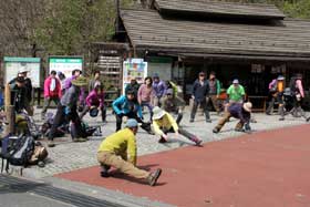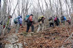 都民の森駐車場で準備体操を行い、各班に分かれてそれぞれリーダー、サブリーダーから注意事項が伝えられる。初登山という受講生が多いせいか、各班でザックの調整、靴紐の締め方などのレクチャーが行われている。ほぼ予定通りに1班から出発。ここから三頭山頂までは約500mの登りだ。まずはウッドチップが敷かれた遊歩道を、あれはエイザンスミレ、これはキブシ、こっちはネコノメソウなどと、草花に詳しい会員が指さしながら歩く。