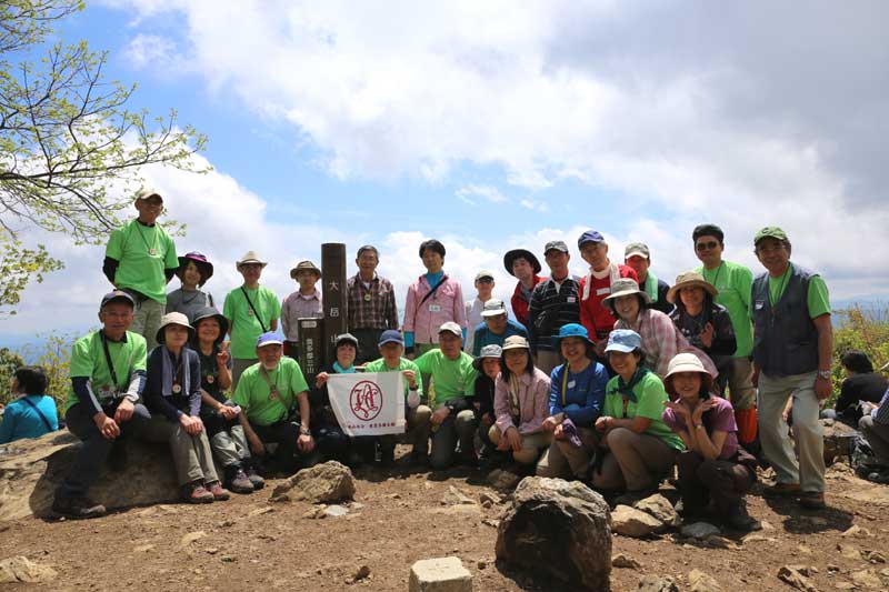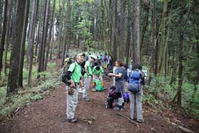 生憎雲があり富士山は見えないが、受講生が登った御前山、三頭山が見えており受講生は満足した。思い思いの昼食後、記念撮影し下山にかかる。岩場の下りに慣れていない受講生と登りの登山者との擦れ違いに、登り以上に時間がかかったが無事大岳山荘まで下る。