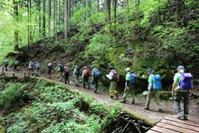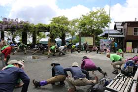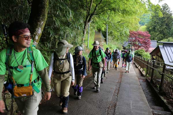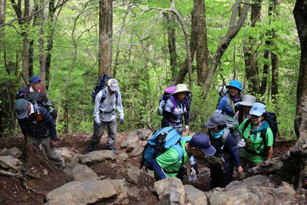 3度目の正直で今回の計画は、2回目の再計画となったが、班構成を3班から2班構成にした初めてのパーティー登山となった。また、今回は新聞記者が同行取材することになった。数日前までの天気予報が芳しくなかったが、回復方向であるのを期待し、藤棚が満開な御岳平に受講生の皆さんがそれぞれの思いで集合した。天気は、まずまずであり、今日こそは登頂をの意気込みでスタートした。