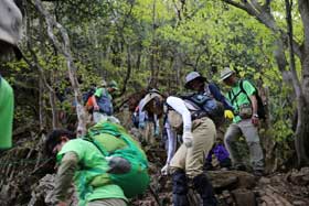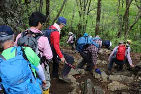 今回は、御岳神社はカットして長尾平に出た。大岳山荘までは順調に来たが、ここから受講生は初めてのコースで一番のハイライトである岩場の通過を慎重に越え、大岳山頂上に到達した。