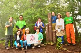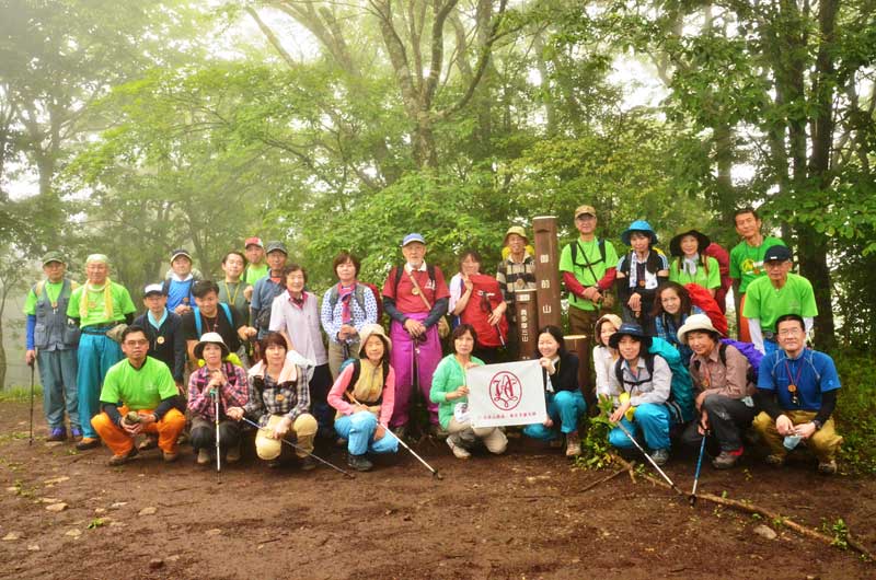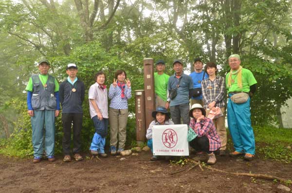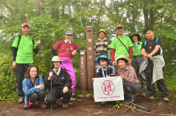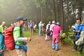1時間程度で小河内峠に着くころには小ぶりとなり、惣岳山への急な登りに取り掛かる時は、雨は止んでくれたが、今度は「ぶよ」の大群の襲来である。座学の際に虫よけの用意を呼びかけたためか、みなさん持参していた。ここで昼食後、山頂に向けて出発。雨でぬかるんだ登山道を、ひたすら足元に視線を落としながら登っていく。登山口を出発して3時間後、ようやく御前山の山頂に到着したが、ガスだらけでまったく展望がない。遅れて到着したグループがいたので、事情を聴いたところ、登山靴の靴底が剥がれてしまったので補修をしていたためと分かり、本日はいろいろな課題をいただいた登山教室となった。山頂で記念撮影後、ぬかるみの登山道を今度は下ることになったが、2回の実技を経験しているためか、みなさん慎重に足を運んでいた。転倒することもなく、ほぼ計画通りに出発した登山口に到着した。
